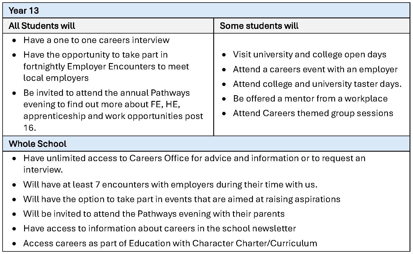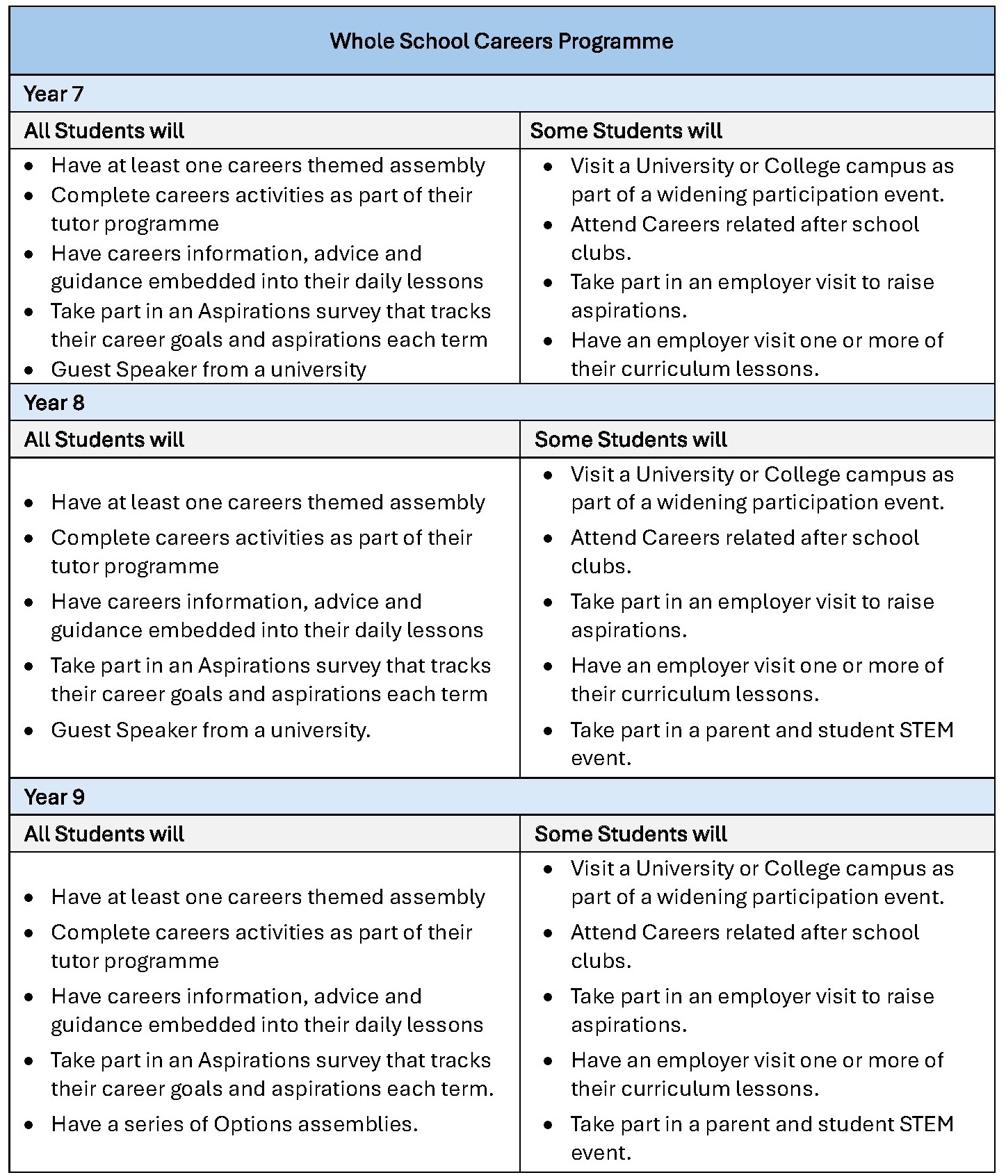To provide an inspiring and innovative program of CIAG, which aims to raise the aspirations of all students. To empower them to make reasoned, informed and appropriate careers choices, which enable them to fulfil their individual potential. Careers Education, Information, Advice and Guidance meets standards suggested by the Gatsby benchmarks.