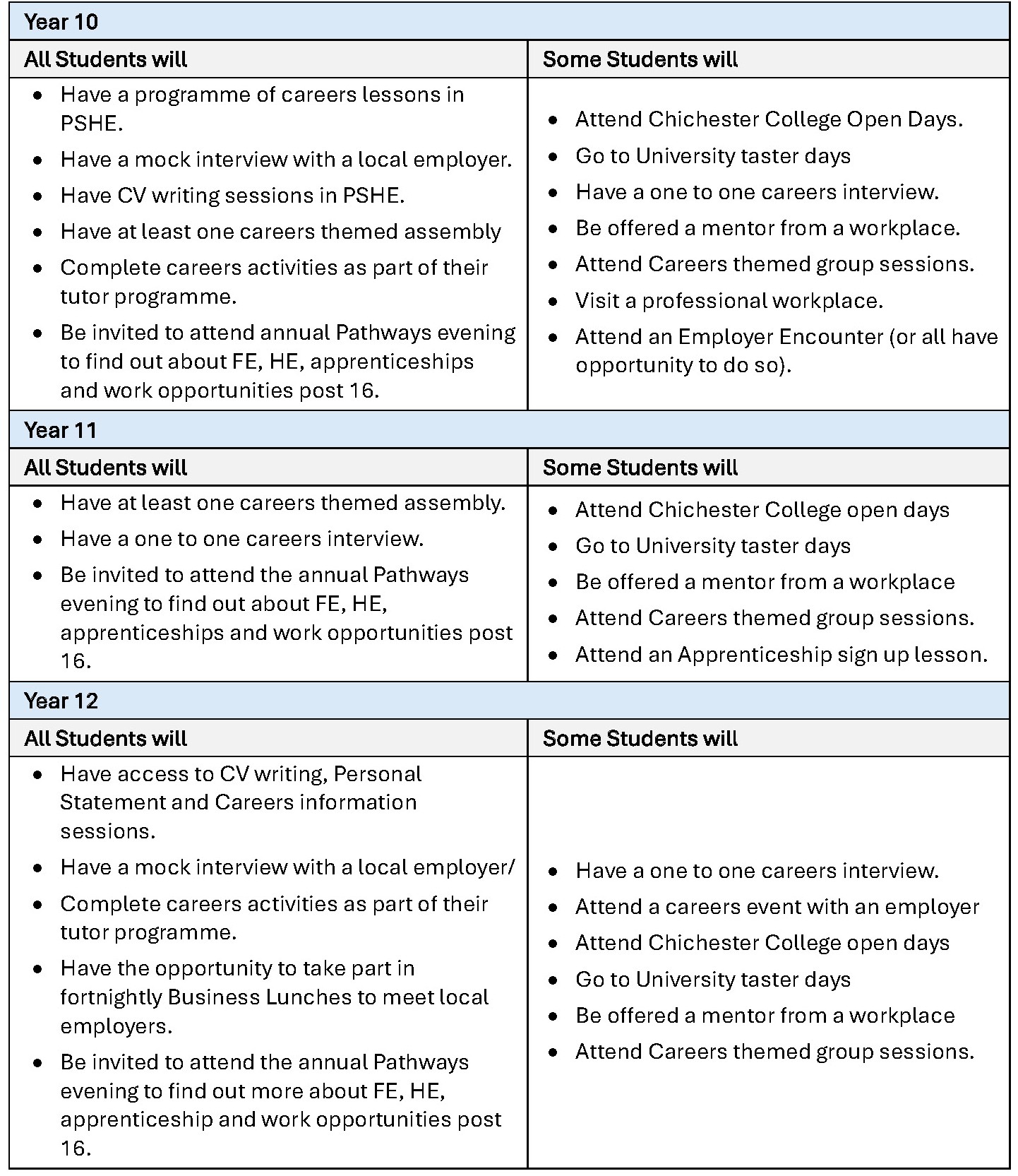 We work closely with the Careers and Enterprise Company who help and support us with our careers provision whilst preparing our students for their future careers. They play a key role in implementing the government’s Careers Strategy ensuring that the Gatsby Benchmarks are in operation. Our Enterprise Coordinator is Sian Lewis and our Enterprise Adviser is Rachael Williams from The West Sussex Growers Association. Both Sian and Rachael work closely with us to ensure that our CIAG offer is of high quality and raises the aspirations of the students in our care.