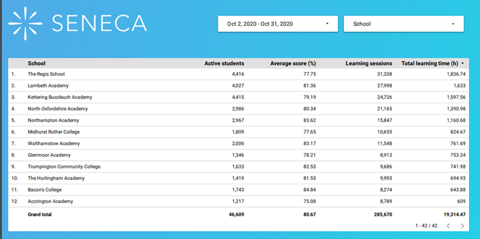 During October we launched Seneca Premium for all students at The Regis School. The United Learning ‘leaderboard’ (shown below) of collective learning hours spent on this platform over the last four weeks shows, The Regis School is top of all UL schools! Whilst this is wonderful for the school and a clear reflection of our students’ attitude to their studies outside the classroom, SENECA is about the students, not the school.