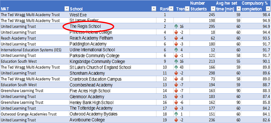 The table below is taken from the SPARX National leaderboard which shows, as a percentage, how many students have completed their Y7 maths homework on time since the start of term. The Regis School is ‘top’ of all United Learning schools/academies and 2nd in the whole country! This is a tremendous effort and clearly demonstrates that our students are taking their learning seriously. Having a mature attitude to academic studies is vital for future success and completing homework is a huge part of this. Well done to all our excellent Year 7 students.