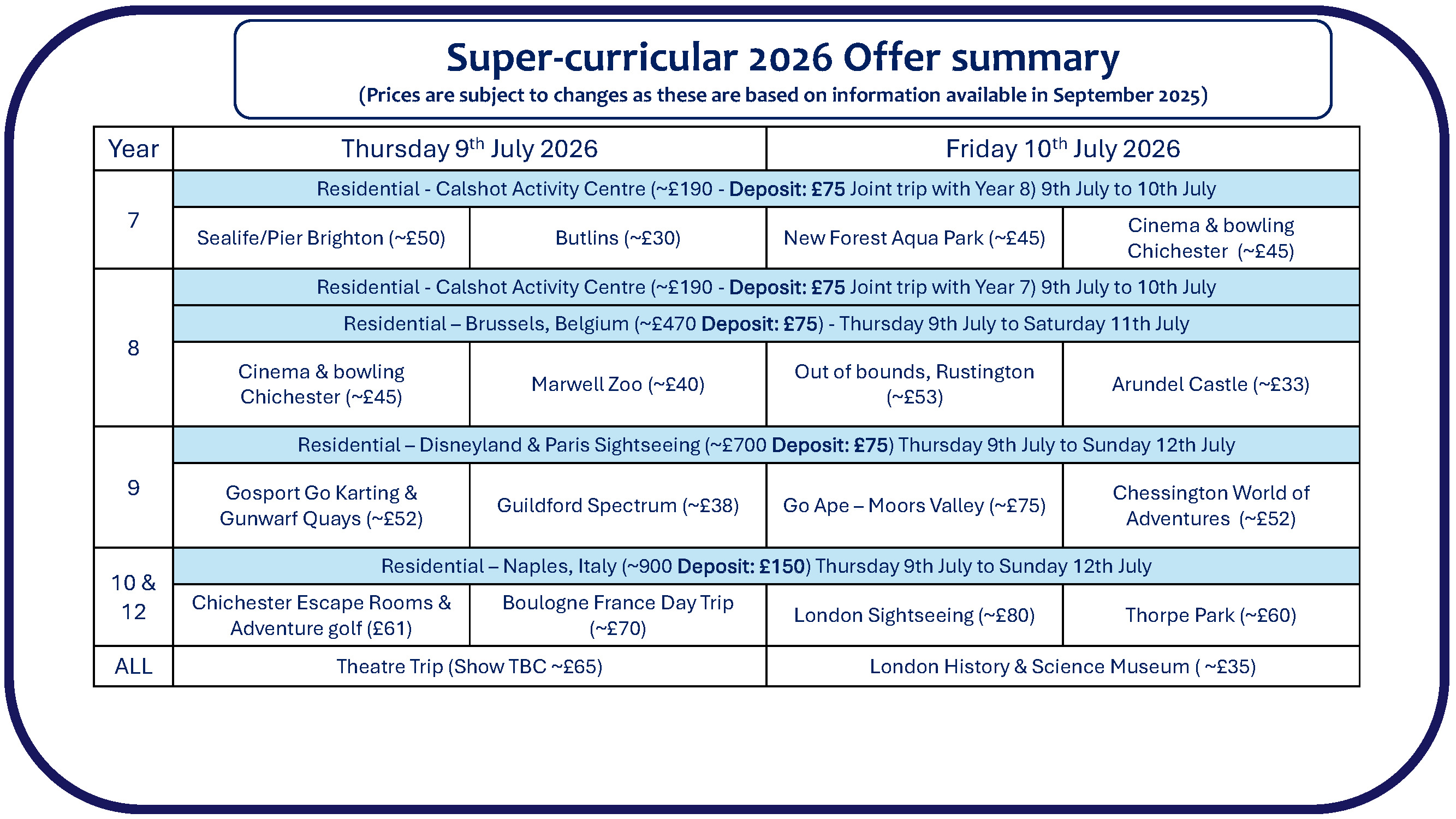 We are excited to introduce the 2026 Super Curricular offer for Years 7 to 10 and Year 12. The dates for this event will be 9th July 2026 and 10th July 2026. This involves two days of students being able to engage in a range of opportunities that are outside the curriculum and students have been shown this in tutor time this week.