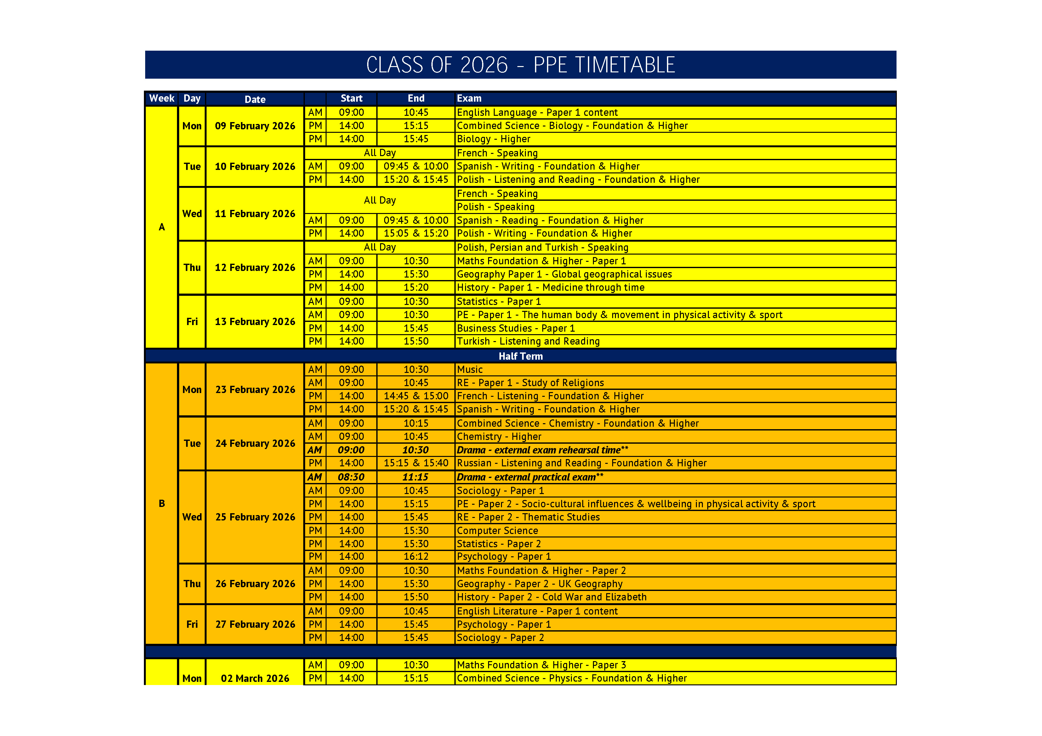 Year 11 PPE's February/March 2026